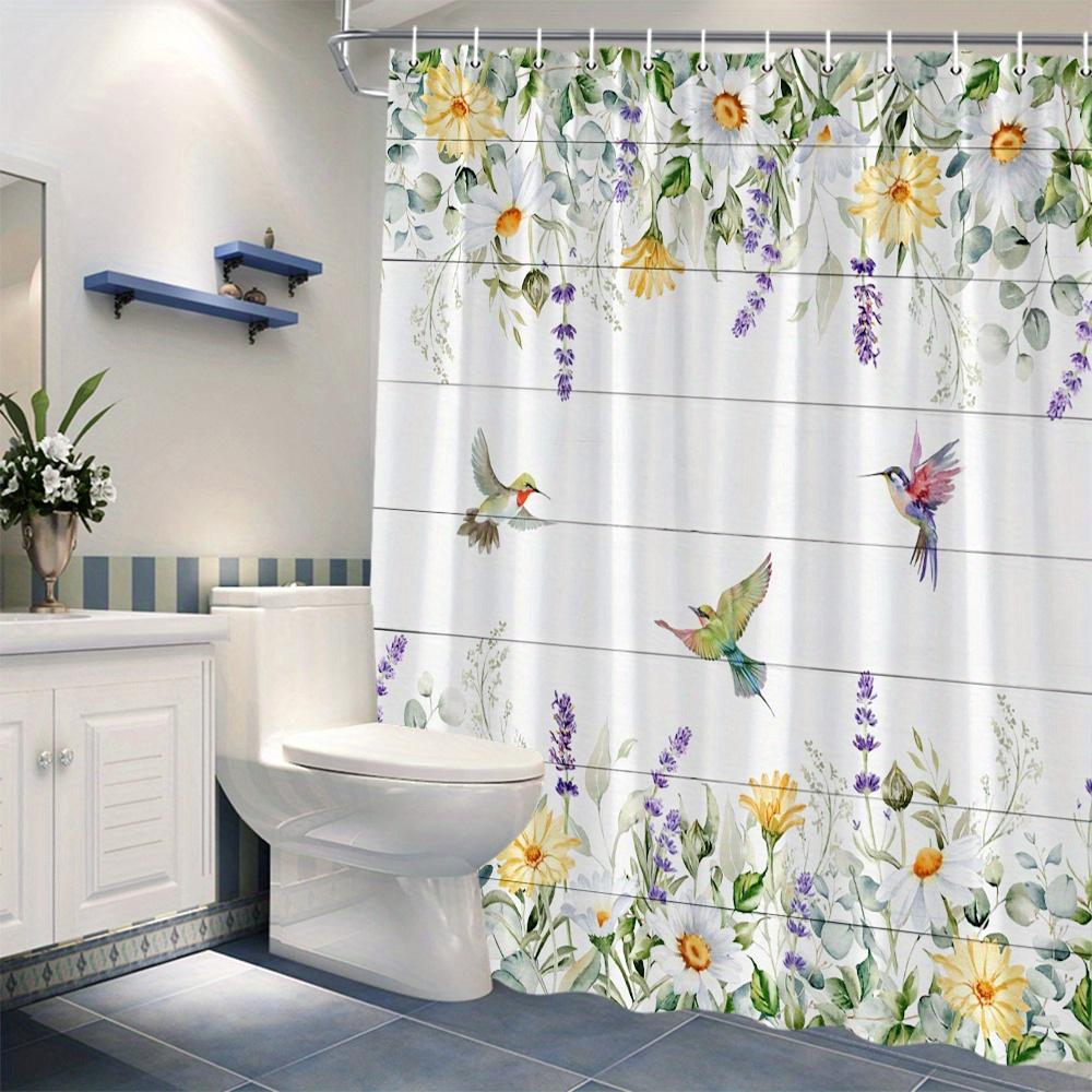Charming Floral and Hummingbird Shower Curtain for a Fresh and Inviting Bathroom, Featuring Vibrant Yellow Daisies, Purple