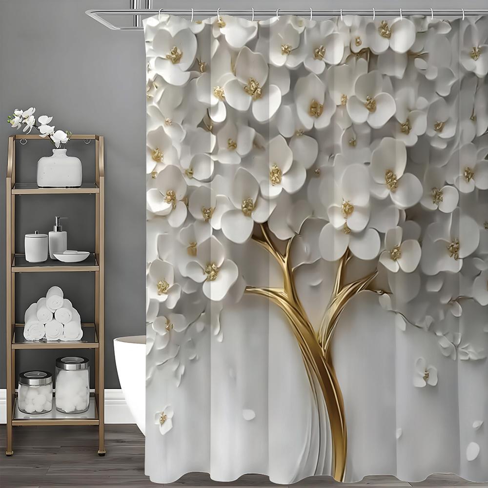 Vit Blommig Lågrelief Duschdraperi, Dekorativt Duschdraperi för Badrum, Vattentätt Duschdraperi med Krokar