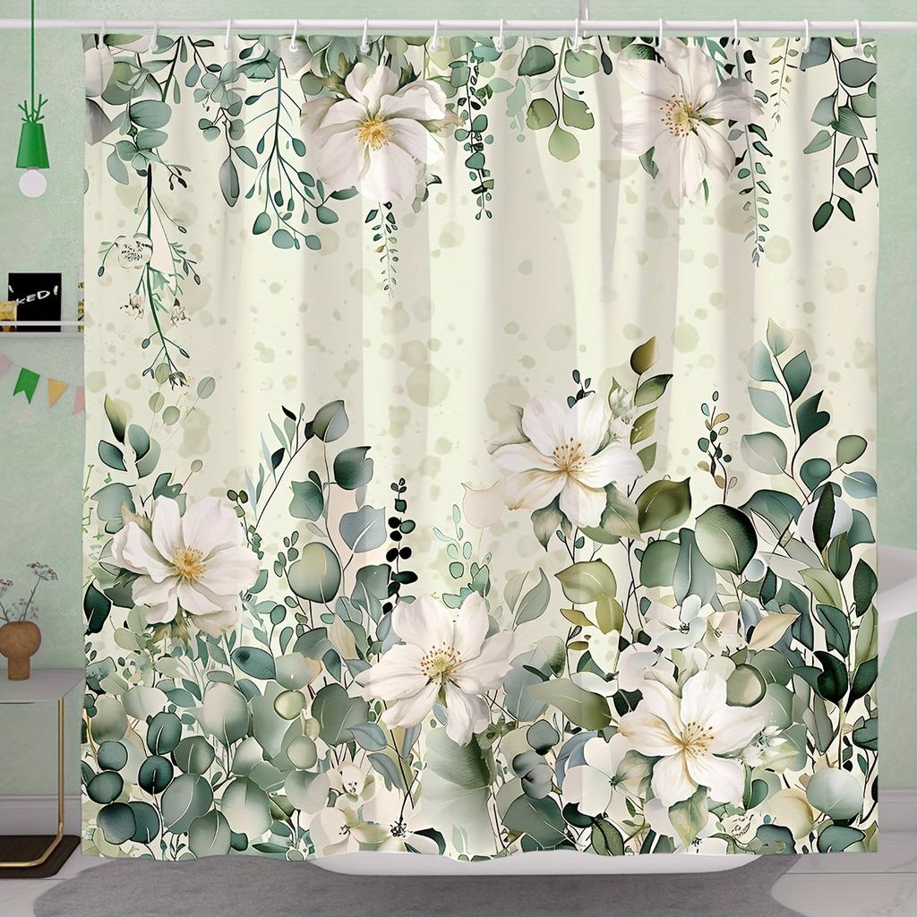 1pc Machine Washable Polyester Shower Curtain - Wildflower Botanical Design in Green & Beige, 71x71", 12 Hooks, Farmhouse Style