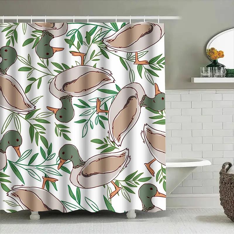 Colorful Duck Pattern Shower Curtain Bathroom Decor Green Leaves White Fabric Waterproof Home Decoration