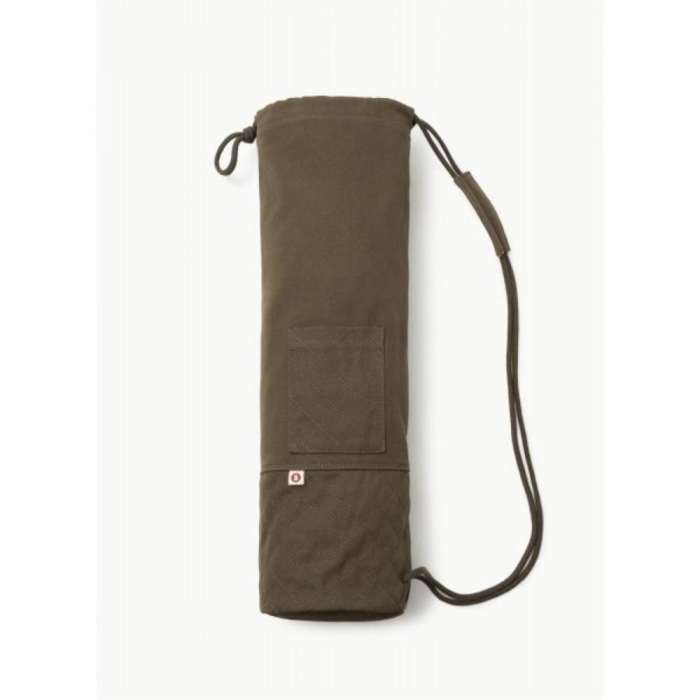 The BM mat carrier_Khaki is a cylindrical eco-bag designed to carry yoga mats. It features an outer pocket detail and stitch points for added style, and the shoulder strap is reinforced with studs for safe usability. The drawstring design allows for variety in styling, enhancing its versatility.