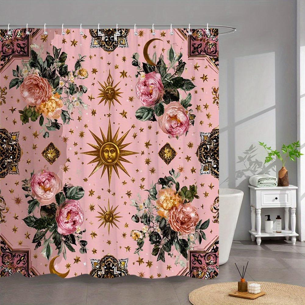 1pc Bohemian Floral & Botanical Shower Curtain with 12 Hooks - Pink Bath Curtain, Machine Washable, Full Coverage for bathtub,