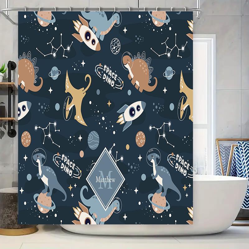 Unique Space Dino Blue Shower Curtain Personalized for Kids Bathroom Decor Customizable Design for Home Decoration in Bath Linen