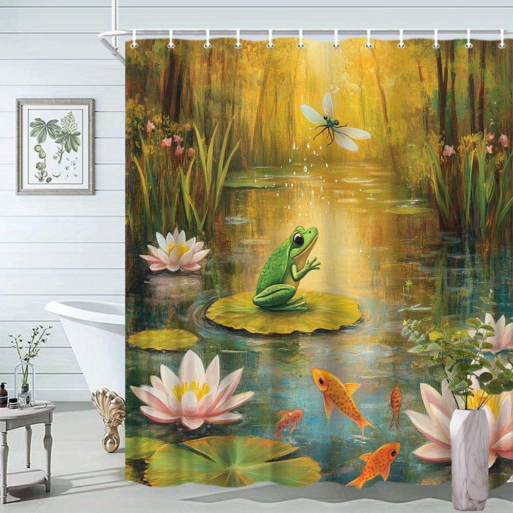 Frog Natural Scenery Shower Curtain - Pond Theme, Lotus & Fish, Creative Artistic Polyester, 12 Hooks, Bathtub Partition