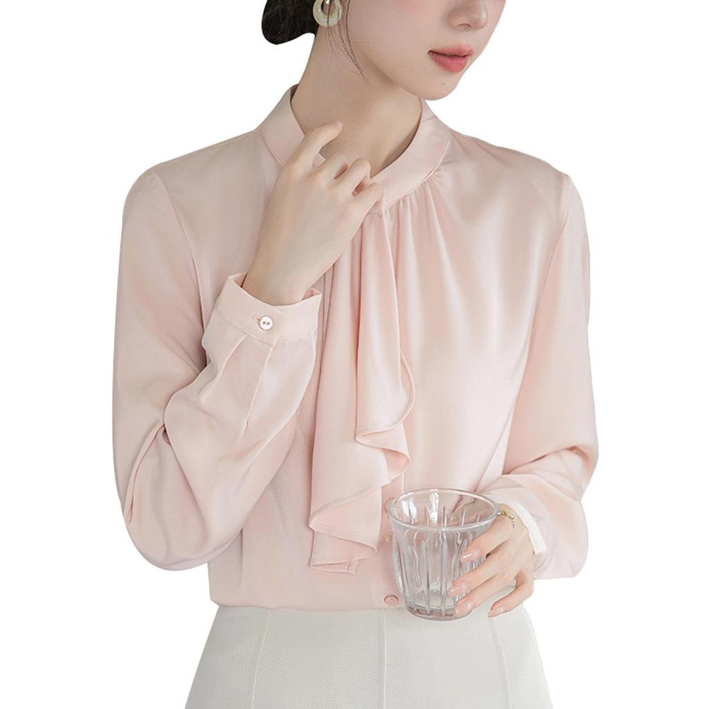 【Elegant Chiffon Blouse】This blouse features a beautifully flowing tucked neckline. Its elegant sheen creates a feminine and sophisticated look. The smooth texture makes it a blouse you'll want to wear again and again. Sizes (CM): 【S】: Length 63, Shoulder Width 38, Bust 98, Sleeve Length 59; 【M】: Length 64, Shoulder Width 39, Bust 102, Sleeve Length 60; 【L】: Length 65, Shoulder Width 40, Bust 106, Sleeve Length 61.