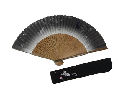 [Hasegawa] Kyoto-style fan with cat pattern, black background, medium-short length, made of karaki wood, embroidered, with fan case and presentation